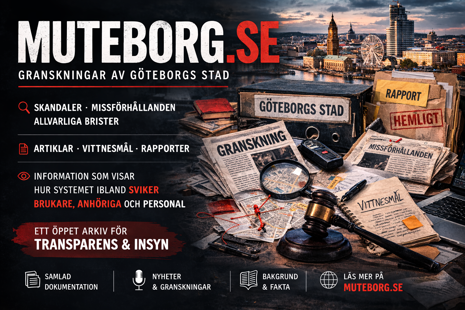 På muteborg.se samlar vi granskningar, artiklar och rapporter om skandaler, missförhållanden och allvarliga brister inom Göteborgs Stad. Här hittar du länkar till journalistiska granskningar, vittnesmål och dokumentation som visar hur systemet ibland sviker både brukare, anhöriga och personal.